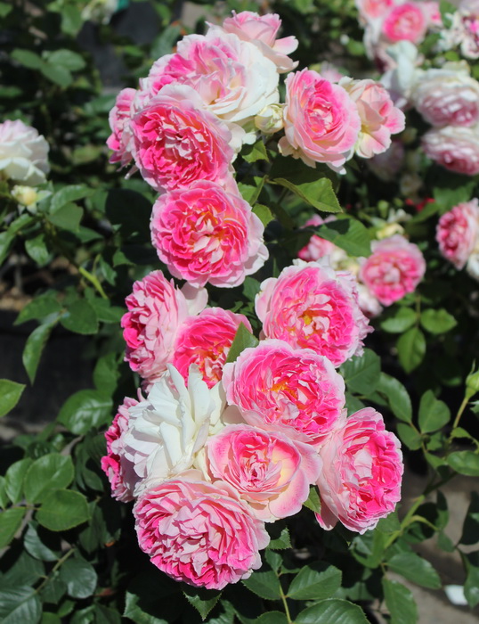 Оригинатор: Interplant. Сортосерия 'Holiday Island Roses'. Цветки 10-12 см, чашевидные, густо-махровые, двухцветные - почти белые крайние лепестки и ярко-розовый центр. На стебле по 3-5 шт. Куст компактный, высотой 0,6-0,8 м, шириной до 0,6 м.