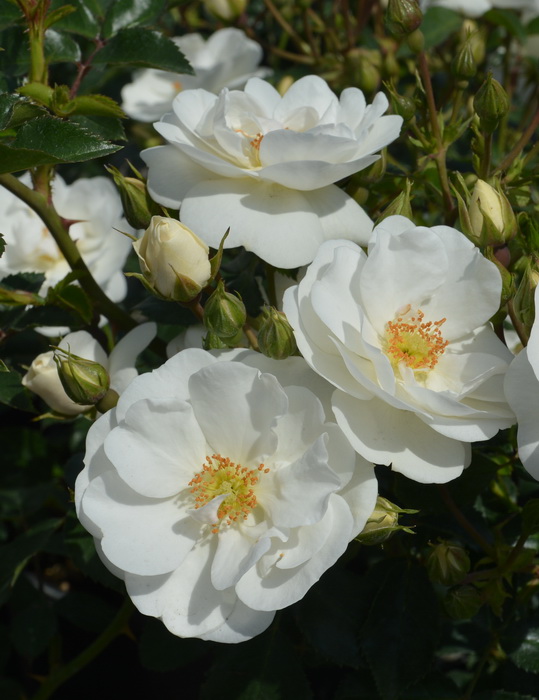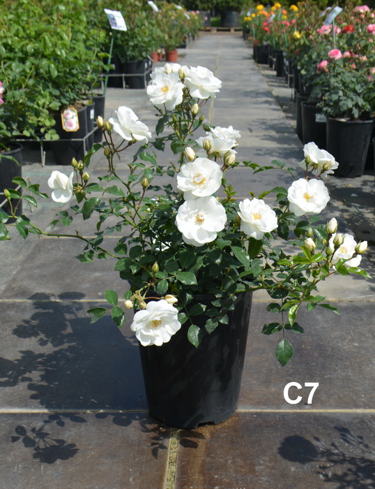 Оригинатор: Kordes. Цветки чисто-белые, махровые, в крупных кистях по 10-15 шт, около 4 см в диаметре, с легким ароматом. Листва густая, очень блестящая. Куст ветвистый, компактный, до 60 см в диаметре. Первое цветение очень обильное, вторая волна слабее. Очень устойчива к заболеваниям, особенно к черной пятнистости. ADR.