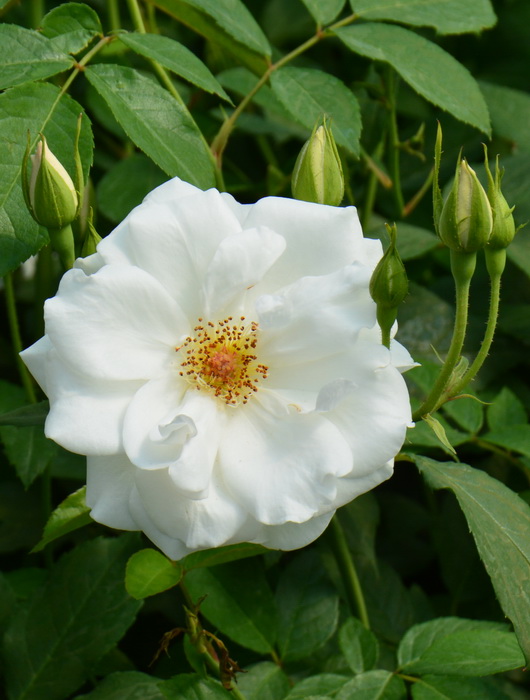 Из бутонов чайной формы распускаются белые махровые ароматные цветы, иногда с розовым оттенком. Цветёт волнами в течение сезона. Листья тёмно-зелёные, слегка глянцевые, крупные. Цветение продолжается в течение всего сезона. Аромат легкий, сладковатый. Куст широкий, с тёмной зелёной листвой, высотой около 1 м. Местоположение: Солнце. Почва: плодородная, хорошо дренированная.