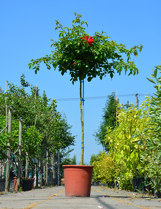 В данном случае штамбовая роза высаживается в грунт вместе с контейнером. Осенью растение выкапывается также вместе с контейнером и всю зиму хранится в помещении с достаточной влажностью и температурой от -3 до 0 С. По мере роста растения, его пересаживают в контейнер большего размера. Как правило, пересадка требуется не раньше, чем через год.