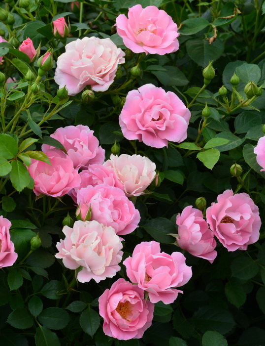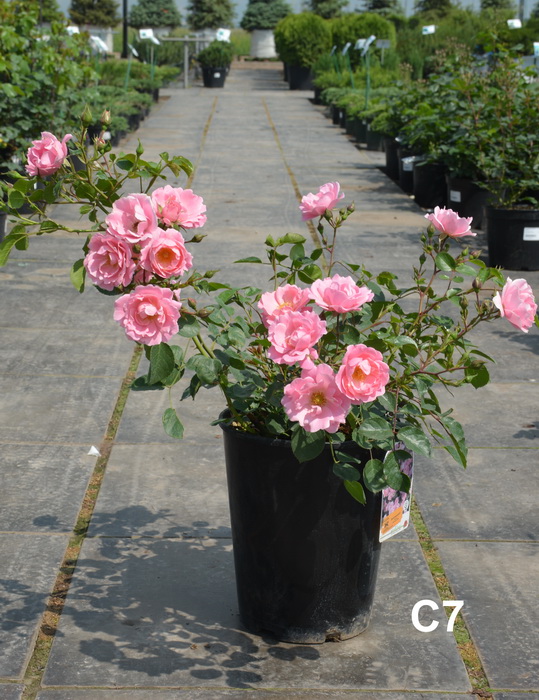 Оригинатор: Kordes. Цветки раскрываются темно-розовыми и выгорают до бледно-розовых, при этом тычинки темнеют, а лепестки становятся привлекательно волнистыми. Цветки появляются в огромном количестве в кистях по 5-25 шт по всей поверхности куста. Хотя цветки хороши и при ближайшем рассмотрении, необыкновенным сорт делает очень обильное первое цветение, и тот факт, что растение продолжает цвести до конца осени.