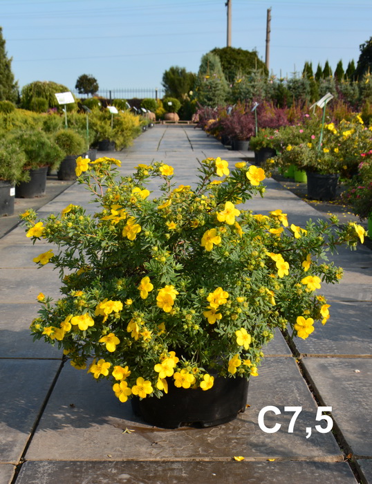 Кустарник. Высота до 1,2 м, диаметр кроны 1,2 м. Крона прямая, густая, кустистая. Кора серо-коричневая, отслаивающаяся. Листья перисто-сложные, состоят из пяти листочков, темно-зеленые. Период цветения июнь-октябрь. Цветки желтые, очень крупные. Местоположение: солнце, полутень. Почва: лёгкая, влажная, плодородная. Морозостойкая.