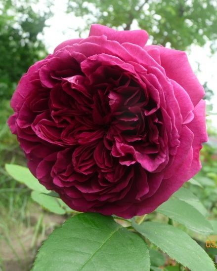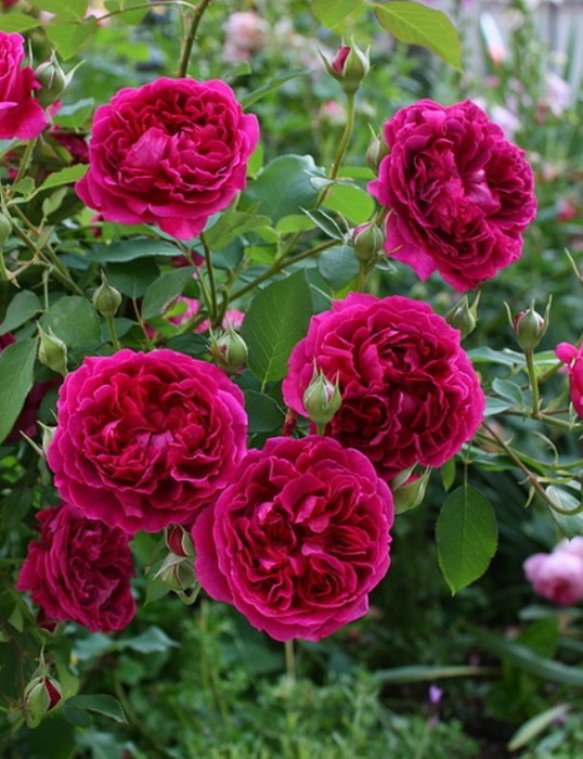 David Austin, Великобритания. Цветки яркого бархатно-красного цвета, со временем переходящего в столь же насыщенный пурпурный. В начале глубоко чашевидные, затем распускаются в плоские и квартированные, диаметр до 10 - 12 см. Цветет крупными кистями, каждая кисть держится более двух недель. Куст густой, прямостоячий. Высота 1,25 м и ширина 0,75 м. Насыщенный аромат с нотками фиалки и роз.