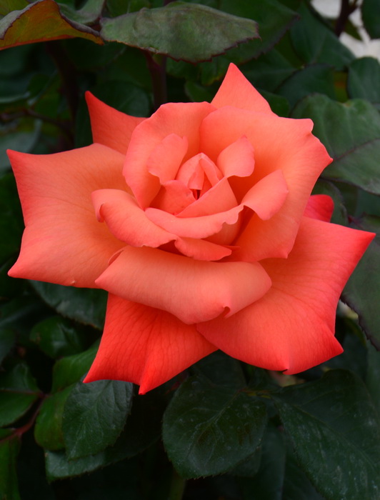 Цветки розово-оранжевого цвета, с желтой подсветкой на оборотной стороне лепестков. Лепестки очень широкие. Цветки крупные, 10-12 см, имеют классическую форму чайно-гибридных роз, обычно появляются в кистях по 3-7 шт. Листва крупная, блестящая, темно-зеленая. Куст очень колючий, сильнорослый, 1,2-1,4 м высотой и до 1,2 м в диаметре.