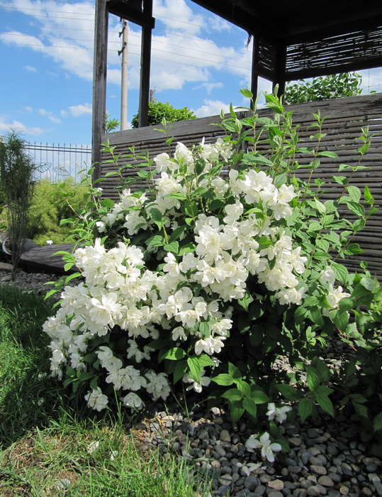 Кустарник. Высота до 2 м, диаметр кроны 1,5-2 м. Крона раскидистая. Ветви изогнутые. Листья тёмно-зелёные. Период цветения конец мая-июнь. Цветки снежно-белые, махровые, душистые, в кистях. Местоположение: солнце, легкая полутень. Почва: увлажненная, без застоя воды, плодородная. Каждые 2-3 года удаляют старые побеги, оставляя те, которые моложе 10-12 лет.