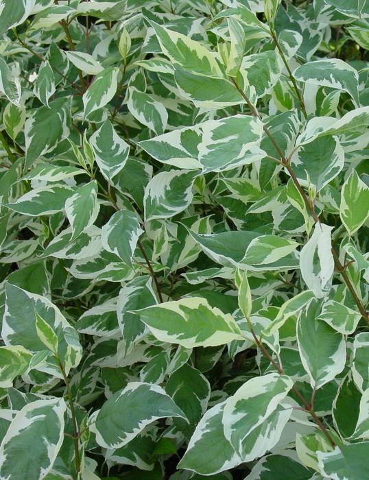 Кустарник высотой 2-3 м и диаметром 1,5-2 м. Крона широкораскидистая. Листья матовые, серо-зеленые с белым окаймлением. Цветки мелкие, белые, в щитковидных соцветиях до 5 см в поперечнике. Плоды шаровидные, белые. Местоположение: Солнце, полутень. Почва: рыхлые, влажные суглинки и супеси. Формирующая обрезка, низкая обрезка старых кустов в начале весны делает куст более пышным.