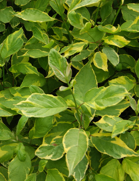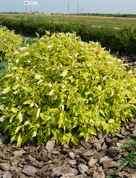 Кустарник высотой и диаметром кроны до 1,5-2 м. Крона широко раскидистая. Кора красно-бордовая. Листья зеленые с желтой каймой. Цветки мелкие, белые, в щитковидных соцветиях. до 5 см в поперечнике. Плоды шаровидные, белые. Местоположение: Солнце, полутень. Почва: рыхлые, влажные суглинки и супеси. Формирующая обрезка, низкая обрезка старых кустов в начале весны делает куст более пышным.