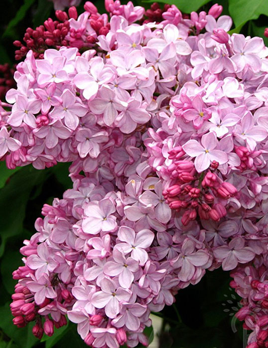 Цветёт в ранние сроки. Бутоны очень крупные, тёмно-розовые, в отдельные годы молочные с зеленоватым оттенком. Простые, очень крупные цветки (до 4,5 см) чистой, нежной лилово-розовой окраски, слабо выгорающей до голубовато-розовой. В пасмурную погоду и в тени окраска лепестков становится лиловой. Сорт очень красивый, с открытым, ранним, нежным цветением. Большое впечатление производят крупные соцветия, состоящие из 3-5 пар широкопирамидальных сквозистых метёлок. Кусты среднего размера, полураскидистые.