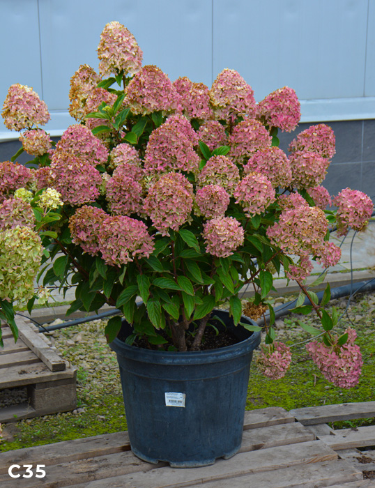 Стерильные цветки многочисленные, лаймового цвета, который переходит сначала в светло-розовый, а затем постепенно становится красным и тёмно-красным. Соцветия большие, конусовидные. Цветение обильное, в июле-сентябре. Ветви крепкие, прямые. Куст высотой 100 см и шириной 80 см, очень компактный, разветвлённый. Хорошо подходит для горшков на террасе, патио или балконе. Место солнечное или полутенистое.
