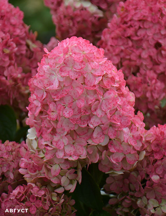 Гортензия метельчатая Pandalus, серия PAN, ароматные — компактный сорт с крупными, очень плотными метелками. В начале цветения окраска соцветий лимонно-белая, к концу сезона цвет меняется на темно-розовый. Сорт отличается очень хорошим ветвлением. Максимальная высота и ширина взрослого растения до 120 см. Почти не требует обрезки для регулирования роста.