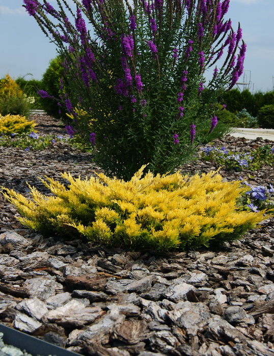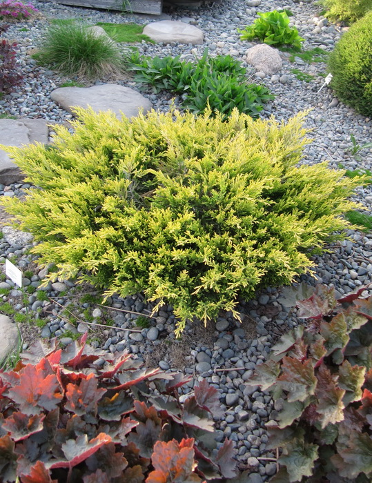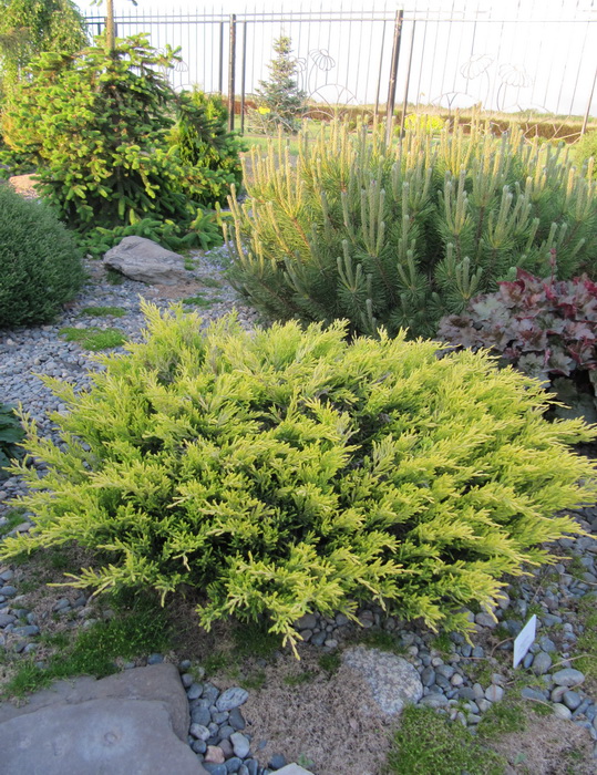 Карликовый кустарник с симметричной, округлой, густой кроной. Высота 0,25 - 0,4 м, диаметр кроны 1,2 - 1,5 м. Растет достаточно медленно. Хвоя яркая, золотисто-желтая, осенью приобретает красноватый оттенок, не колючая. За что и получил своё название `Светящийся желтый`. Местоположение: солнце. Почва: супесчаная, суглинистая, умеренно влажная.