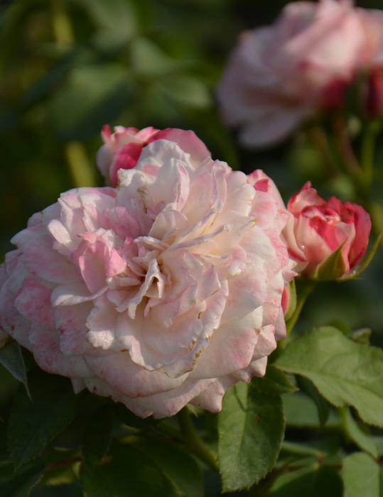 Оригинатор: Guillot. Бутоны белые с красноватым напылением. Цветки диаметром 6-8 см, бело-розовые с красными краями, махровые, квартированные. Листья блестящие, устойчивые к заболеваниям. Кусты густые, высотой 0,8-1 м. Цветение повторное.