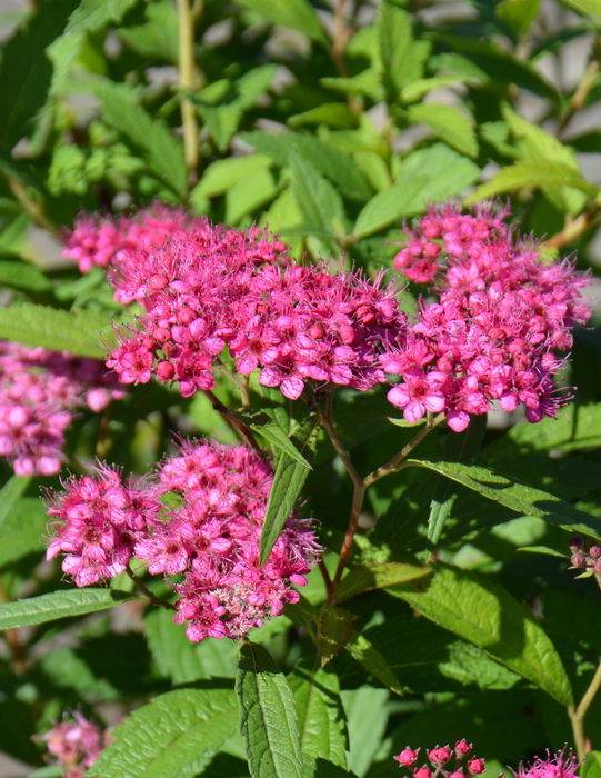 Кустарник. Высота 0,6-0,8 м, диаметр кроны 0,8-1,2 м. Листя зубчатые, зеленые. Единственный сорт, цветки которого имеют разнообразную окраску: белую, розовую и ярко-розовую. Цветки собраны в щитковидные соцветия. Время цветения: июль - август. Обрезая весной оставляют побеги высотой 15-20 см от уровня почвы. Местоположение: Солнце. Почва свежая, садовая.