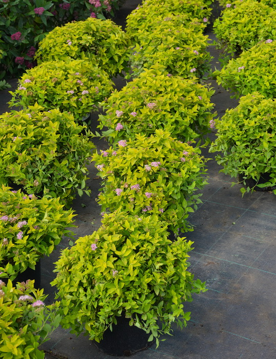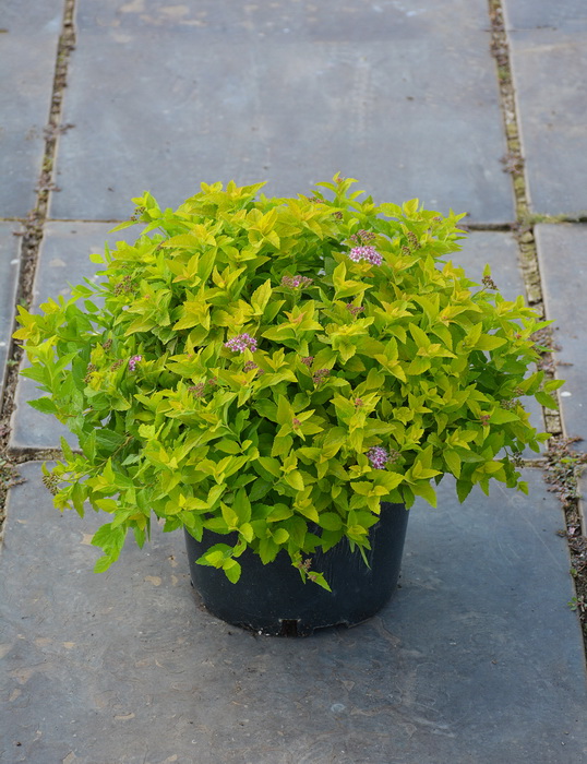 Компактный, красивый кустарник широкой, округлой формы. В высоту достигает 50-60 см., в диаметре до 1 м. Листья ланцетные, ярко-желтые в течение всего сезона. Цветет с июля по сентябрь, розовыми цветками, собранными в плоские щитковидные соцветия. Местоположение: Солнце. Почва свежая, садовая.