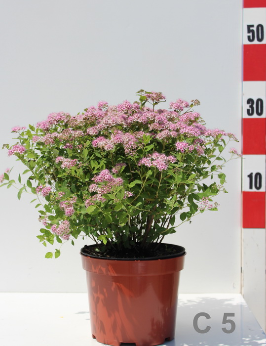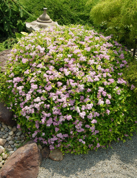 Кустарник. Высота 0,6 м, диаметр кроны 0,8 - 1 м. Крона компактная, округлая. Цветение обильное в июне-июле, цветки розово-красные собраны в щитковидные соцветия. Листья зеленые, мелкие, осенью желто-оранжевые. Обрезая весной оставляют побеги высотой 15-20 см от уровня почвы. Местоположение: Солнце. Почва свежая, садовая.