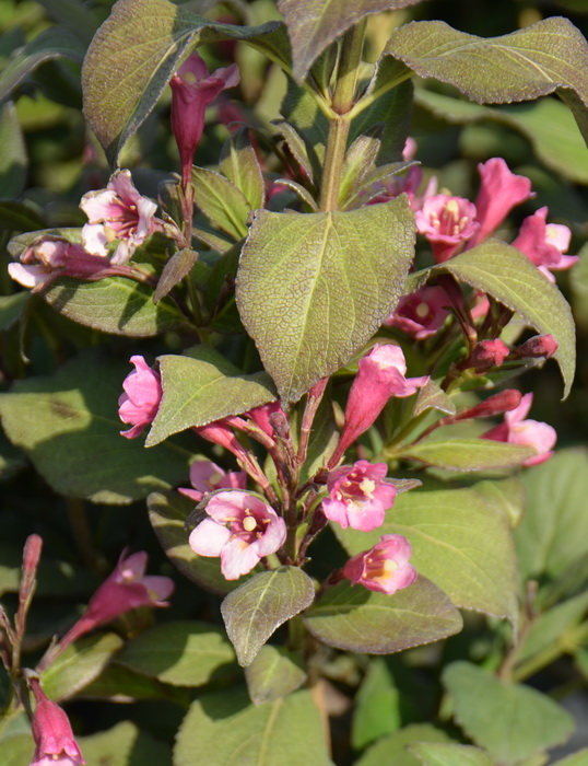 Компактный кустарник округлой формы. Высота 0,9 - 1,5 м. Листья крупные, темно-зеленые, гладкие, заостренные. Период цветения: поздняя весна, начало лета. Цветки крупные (3 - 4 см), колокольчатые, ярко-красные, внутри темно - розовые. Местоположение: Солнце, полутень. Почва: влажная, плодородная, дренированная. Желательно легкое укрытие на зиму или мульчирование приствольного круга.