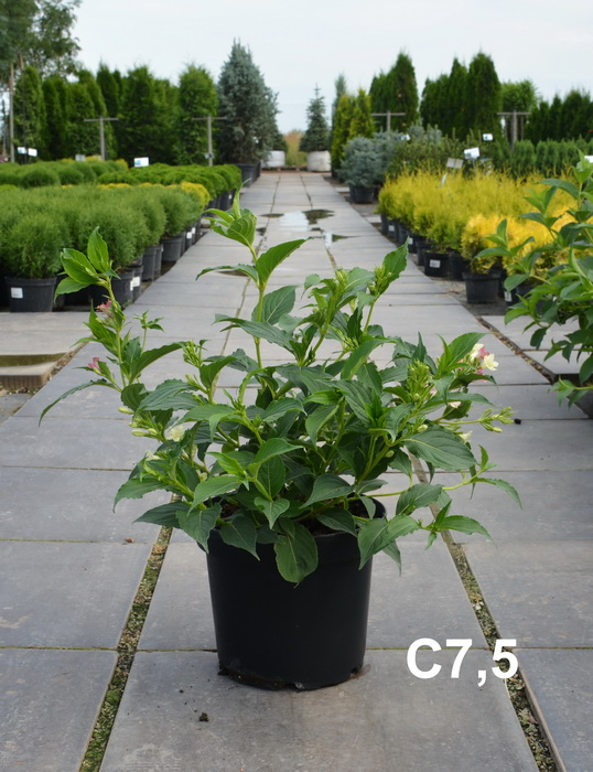 Декоративный кустарник высотой и шириной до 1,5 м. Листья зеленые. Цветки трубчатые, невероятно крупные, в 2 раза крупнее чем у других сортов. Сорт примечателен тем, что одновременно обильно цветут белые, розовые и красные цветки. Цветение в июне, при теплом лете - повторно к осени. Листья зеленые. Местоположение: Солнце. Почва свежая, плодородная, слабокислая.