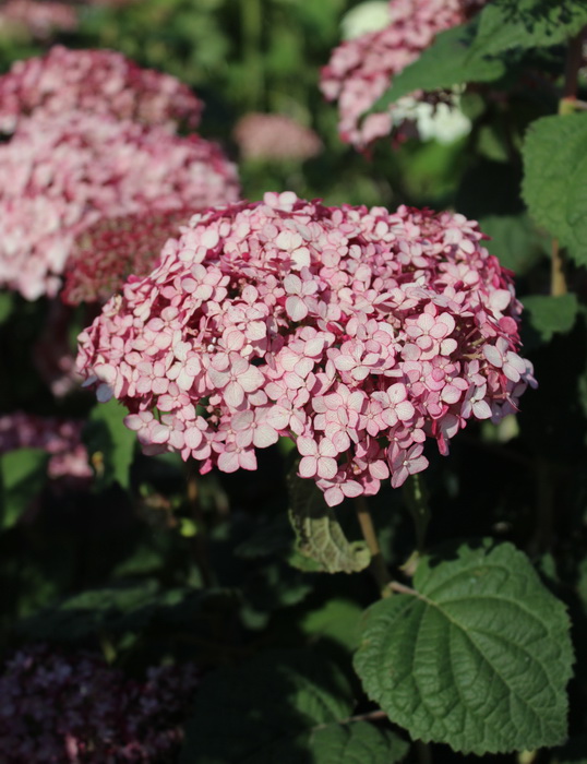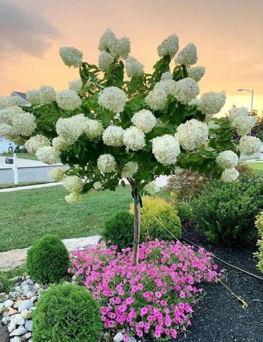 Большинство сортов древовидной гортензии вырастают не более 1,5 метров в высоту, имеют округлую форму кроны. Соцветия крупные, шарообразные, до 25-30 см в диаметре. Период цветения с июня до сентября. В отличие от метельчатой, древовидная гортензия способна переносить кратковременную засуху.