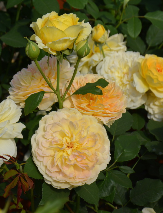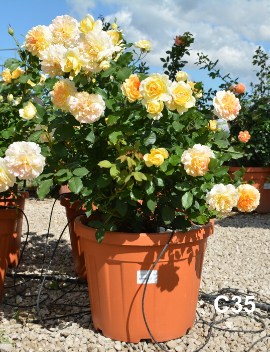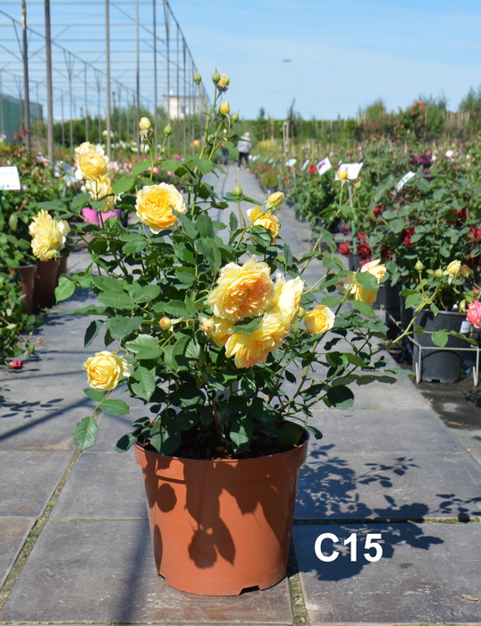 Оригинатор: David Austin. Куст ветвистый, прямостоячий. Высота 0,8-1 м, ширина до 1 м. Цветки золотисто-желтые с насыщенно-абрикосовыми отметинами, изредка с темно-розовым пятном в центре, густомахровые, раскрываются в чашевидные розетки, диаметр 8-10 см. Появляются в кистях по 3-9 шт.  Цветет даже в самые жаркие летние месяцы. Характерный аромат чайной розы с мускусным фоном. Листва темно-зеленая, шипов мало.