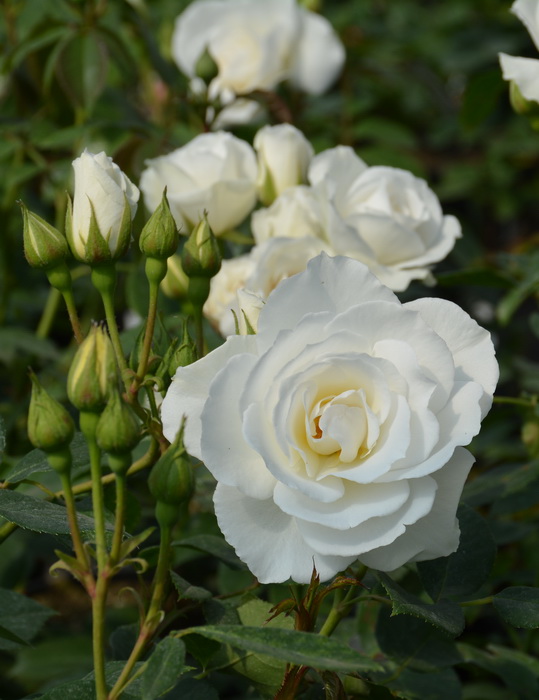 Оригинатор: Tantau. Цветки кремово-белые, крупные, 8-10 см в диаметре, густомахровые, появляются в кистях по 3-5 шт, на высоких цветоносах, и прекрасно контрастируют с роскошной, темно-зеленой, блестящей листвой. Хорошо выдерживает жару и дождь. Куст округлой формы, ветвистый. Местоположение: Солнце. Почва: плодородная, увлажненная, хорошо дренированная.