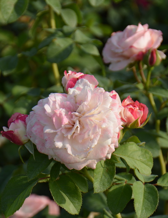 Оригинатор: Guillot. Бутоны белые с красноватым напылением. Цветки диаметром 6-8 см, бело-розовые с красными краями, махровые, квартированные. Листья блестящие, устойчивые к заболеваниям. Кусты густые, высотой 0,8-1 м. Цветение повторное.
