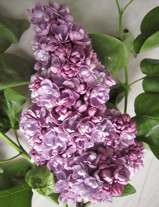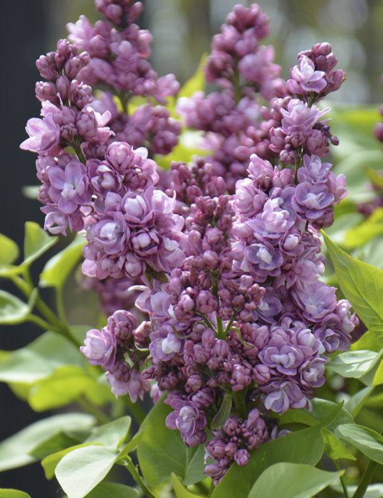 Оригинальный поздний сорт. Соцветие –две пары очень крупных тяжёлых кистей с поникающими верхушками. Бутоны тёмно-вишнёвые, цветки крупные, ароматные, махровые, с расставленными венчиками. Округлые, волнистые лепестки неоднородной переливчатой окраски: с внутренней стороны лилово-фиолетовые, с наружной –шоколадные. Загнутые перламутровые кончики контрастируют с голубым центром цветка.