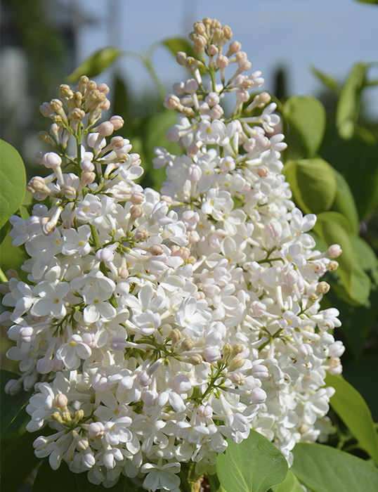 Cорт сирени селекционной группы «Русская сирень». Выделяется среди прочих белых сиреней и прекрасно оттеняет более яркие сорта. Бутоны чуть розоватые. Цветки простые, крупные (2,5 см в диаметре). Лепестки красивой формы, сливочного цвета с необычным тёплым оттенком. Соцветия из трёх конических, крупных (26 см) метёлок. Куст высотой 200-300 см. Срок цветения средний. Зона 3 (до -34ºС).