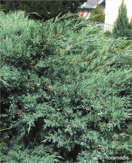 Кустарник. Крона распростертая, с сильными, диагонально приподнятыми или горизонтально лежащими ветвями и свисающими концами побегов. Высота около 1 м, иногда бывает выше, диаметр кроны 2,5 - 3 м. Хвоя чешуевидная, серебристо-серая. Ягоды сизые, многочисленные. Местоположение: Солнце, полутень. Почва: садовая, хорошо дренированная. Переносит стрижку и формовку. Устойчив к ветрам.