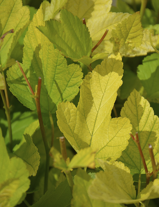 Кустарник. Высота и диаметр кроны 1,2-1,5 м. Крона густая, полушаровидная. Листья весной золотисто-желтые, летом лимонно-желтые, 3-5 лопастные, осенью - бронзовые. В тени зеленеют. Период цветения июнь-июль. Цветки бело-розовые, в щитковидных соцветиях. Плоды округлые, бурые. Местоположение: солнце. К почве нетребователен. Плохо переносит избыточное увлажнение.