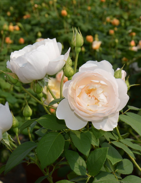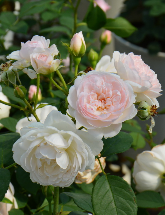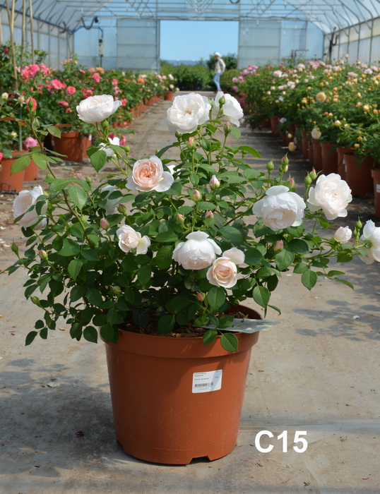 Оригинатор: David Austin. Высота куста до 1,2 м. Бутоны теплого розового цвета раскрываются, чтобы показать цветки чистого белого цвета с легким намеком на розовый на самой ранней стадии цветения. Цветок чашеобразный с вогнутыми лепестками привлекающими к себе внимание игрой света и тени. Со временем цветок раскрывается пошире и можно увидеть блеск тычинок внутри. Цветки не теряют форму при влажной погоде и имеют сильный аромат мирры.