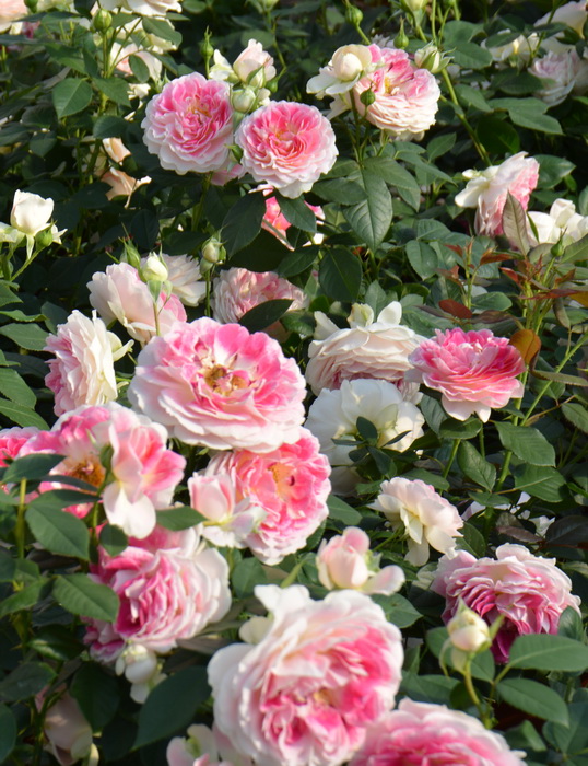 Оригинатор: Interplant. Сортосерия 'Holiday Island Roses'. Цветки 10-12 см, чашевидные, густо-махровые, двухцветные - почти белые крайние лепестки и ярко-розовый центр. На стебле по 3-5 шт. Куст компактный, высотой 0,6-0,8 м, шириной до 0,6 м.