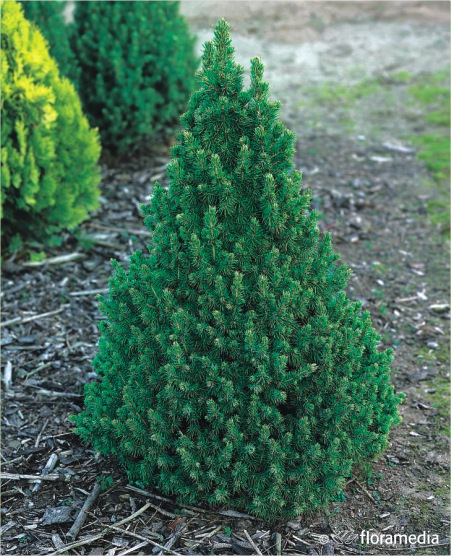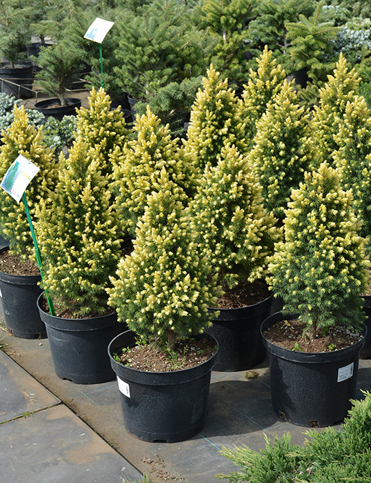 Карликовая форма, крона коническая, плотная. Высота 1,5 - 2 м, шириина 0,6 - 0,8 м, ежегодный прирост 5 - 6 см. Особенно декоративнеа весной - с молодым приростом желтого цвета. Летом хвоя зеленая. Растет медленно. Местоположение: полутень. Почва: богатые гумусом, увлажненные, свежие суглинки и супеси. Рекомендуется укрывать от солнечных ожогов на ранневесенний период.