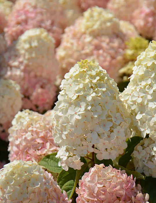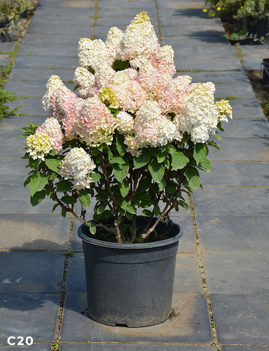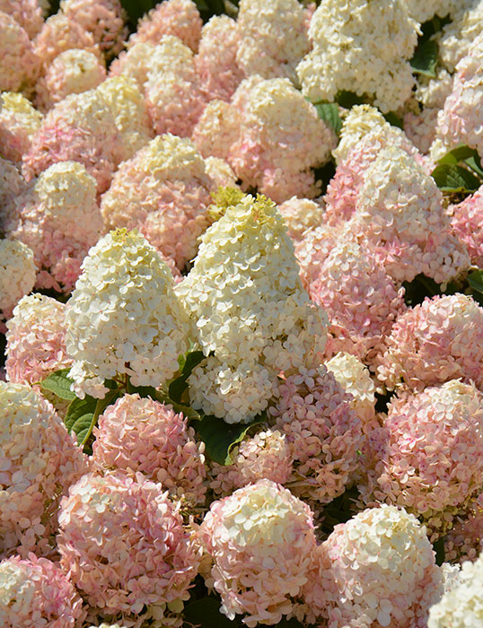 Гортензия метельчатая Pandalus, серия PAN, ароматные — компактный сорт с крупными, очень плотными метелками. В начале цветения окраска соцветий лимонно-белая, к концу сезона цвет меняется на темно-розовый. Сорт отличается очень хорошим ветвлением. Максимальная высота и ширина взрослого растения до 120 см. Почти не требует обрезки для регулирования роста.