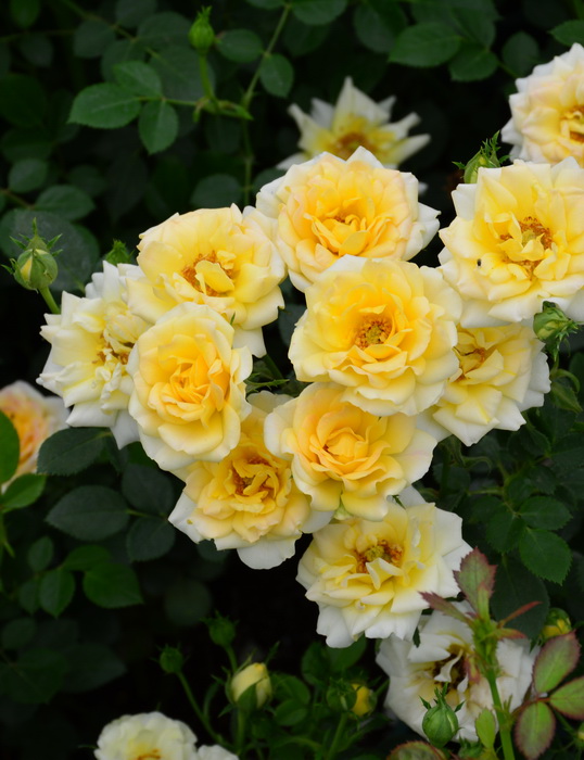 Оригинатор Olesen (Дания) 1988г. Высота куста 0,6-0,8 м, выпускает дуговидные побеги. Цветки 3-4 см, ярко-желтые, когда только раскроются, с золотыми и янтарными тонами ближе к центру. Выгорают до лимонных и кремовых, густомахровые, в кистях по 3-8 шт. Местоположение: Солнце. Почва: плодородная, хорошо дренированная.