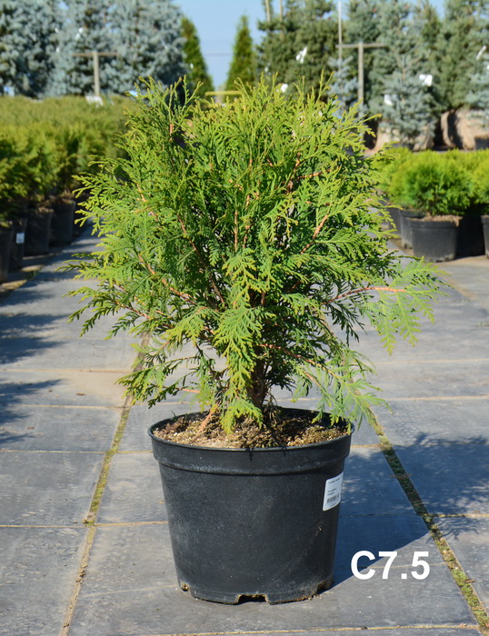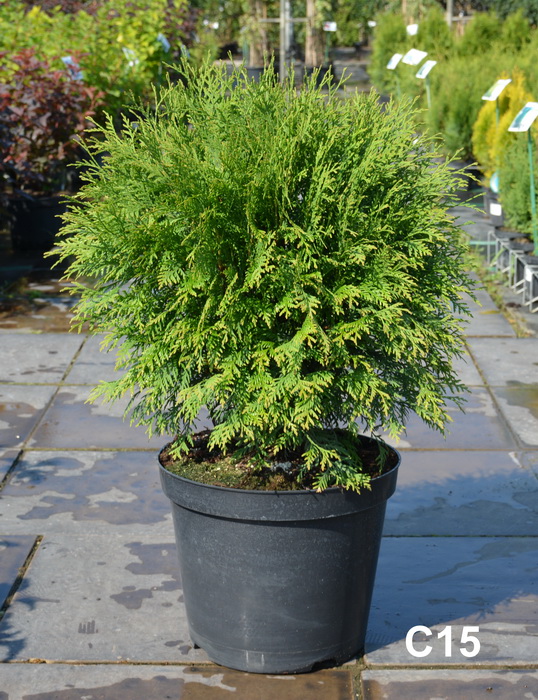 Карликовая туя с густой, шаровидной кроной в молодом возрасте и яйцевидной позднее. Высота взрослого растения 1,5-2,5м, диаметр до 1,3м. Хвоя красивого светло-зеленого цвета, сохраняющегося на протяжении зимнего периода. Ежегодный прирост 4-5 см. Легко переносит загазованный воздух городов. К почве не требовательна, лучше растет на свежих, увлажненных, плодородных суглинках, без застоя воды.