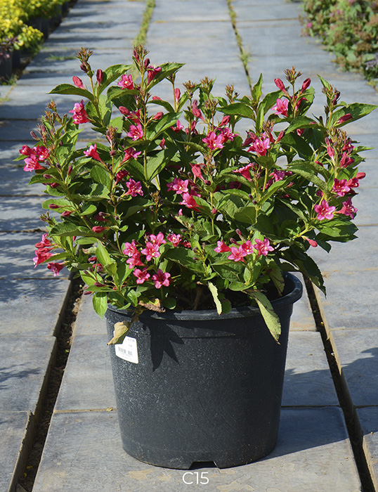 Компактный кустарник округлой формы. Высота 0,9 - 1,5 м. Листья крупные, темно-зеленые, гладкие, заостренные. Период цветения: поздняя весна, начало лета. Цветки крупные (3 - 4 см), колокольчатые, ярко-красные, внутри темно - розовые. Местоположение: Солнце, полутень. Почва: влажная, плодородная, дренированная. Желательно легкое укрытие на зиму или мульчирование приствольного круга.
